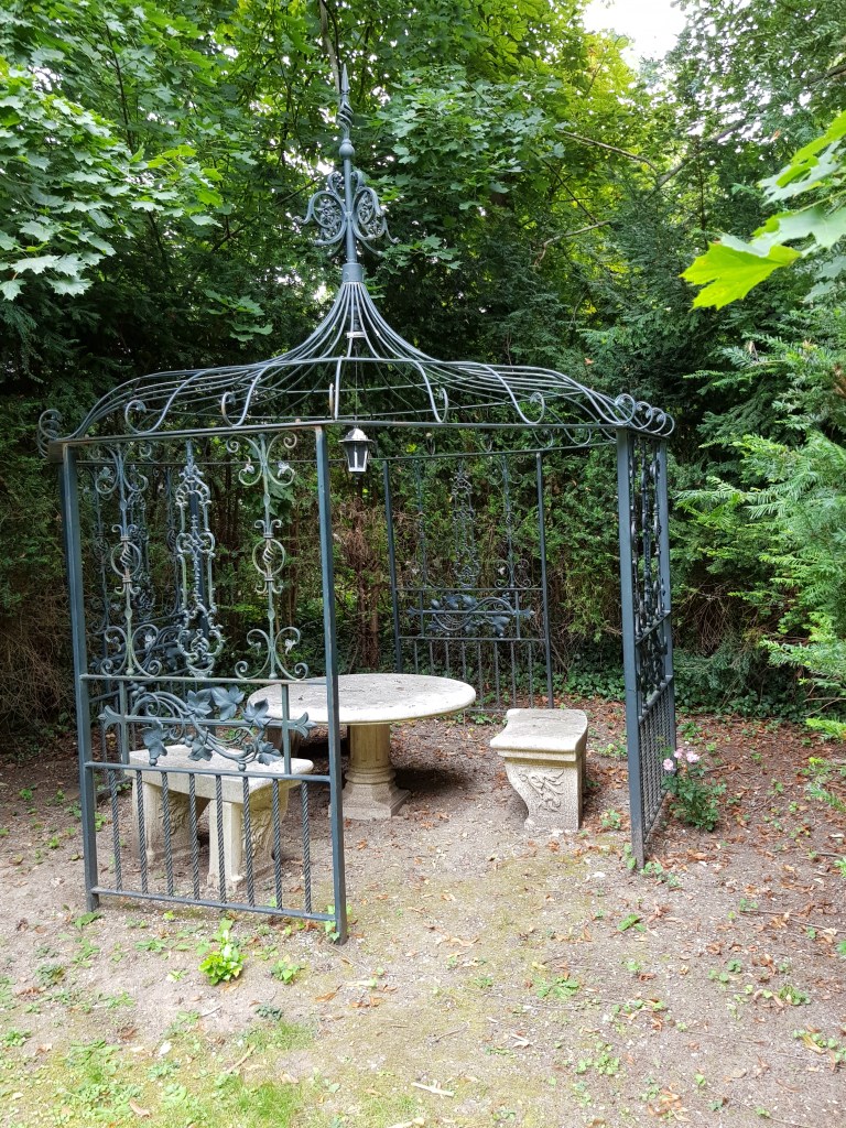 Il y a un petit rosier au pied de la tonnelle.